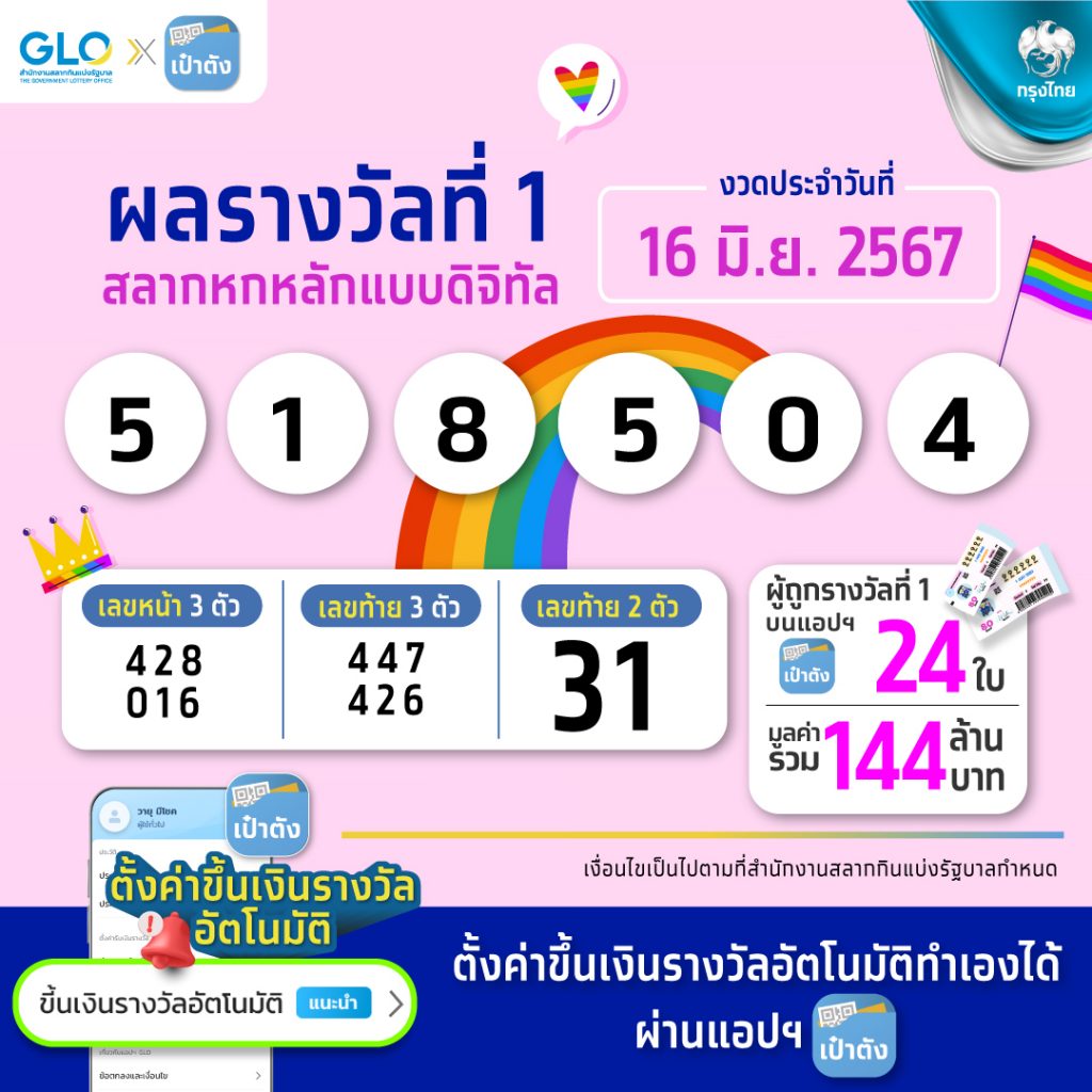 เมื่อวันที่ 16 มิถุนายน 2567 ผลรางวัลสลากดิจิทัลประกาศออกมาแล้ว โดยมีเลขรางวัลที่ 1 คือ 518504 มีผู้ถูกรางวัลรวมทั้งสิ้น 24 ใบ คิดเป็นเงินรางวัลรวม 144 ล้านบาท